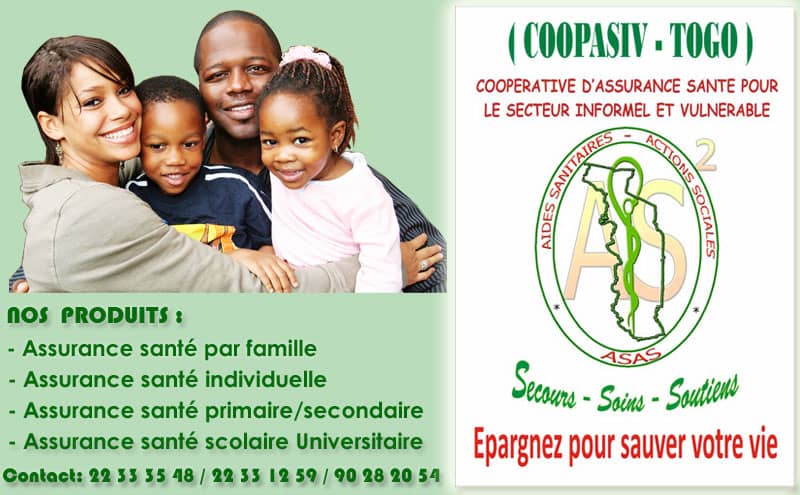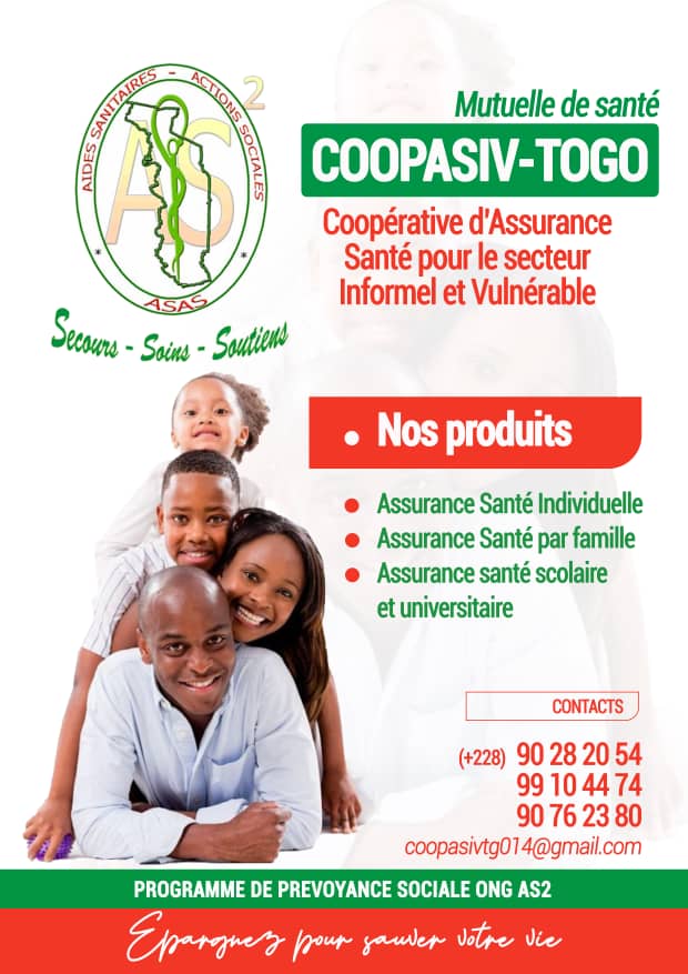 COOPASIV-TOGO est une mutuelle de santé pour le secteur informel et les couches vulnérables. Organisation apolitique à but non lucratif, elle voit le jour, le 05 janvier 2014 à Lomé sur initiative de l’ONG “AIDES SANITAIRES-ACTIONS SOCIALES”. Elle intervient également dans le domaine de prévoyance sociale. Elle est régie par la loi du 1er juillet 1901 rendue applicable au Togo par le décret du 13 mars 1946 promulgué par arrêté du 08 avril 1946.