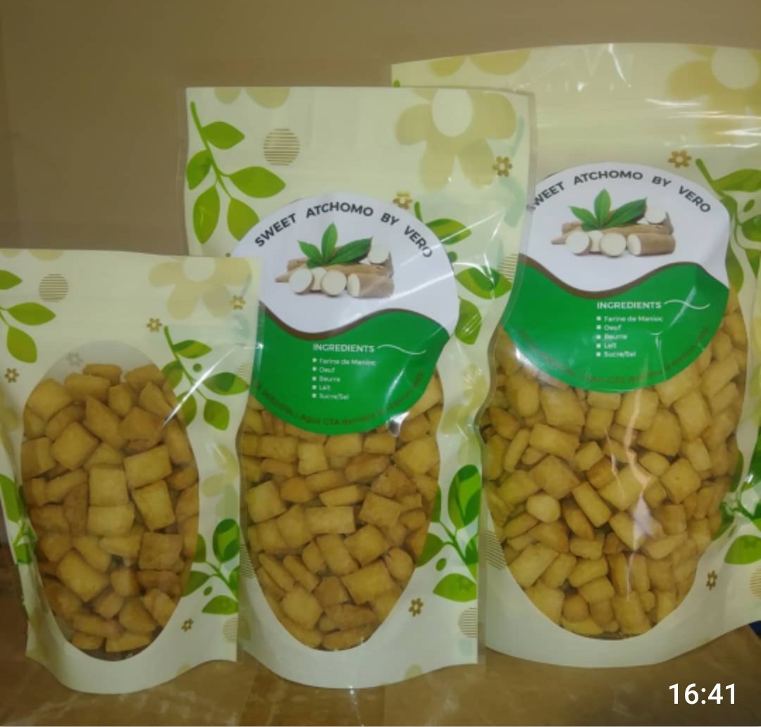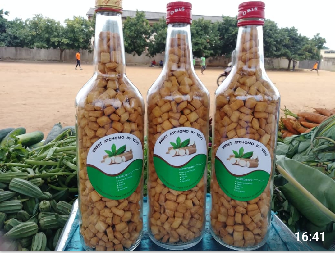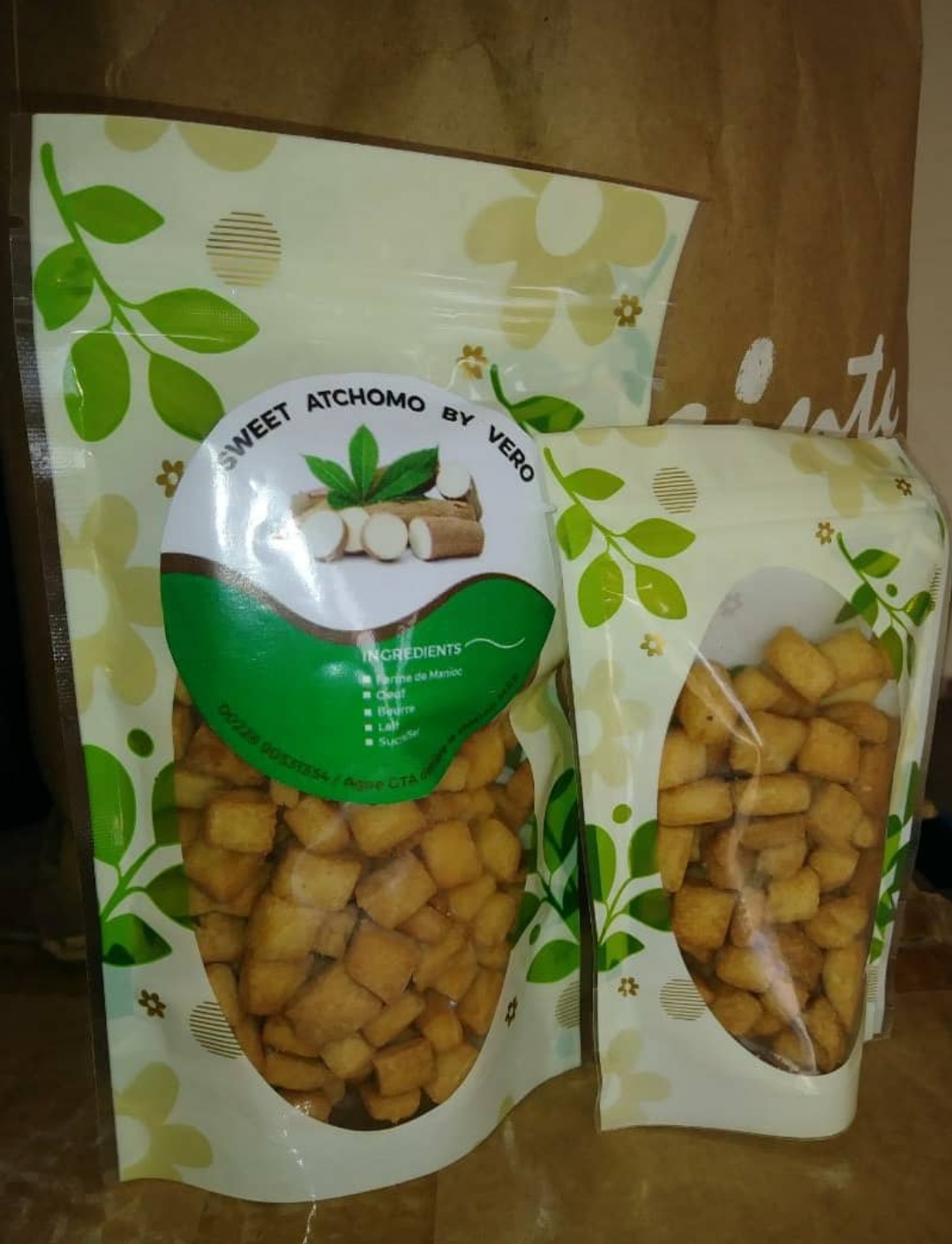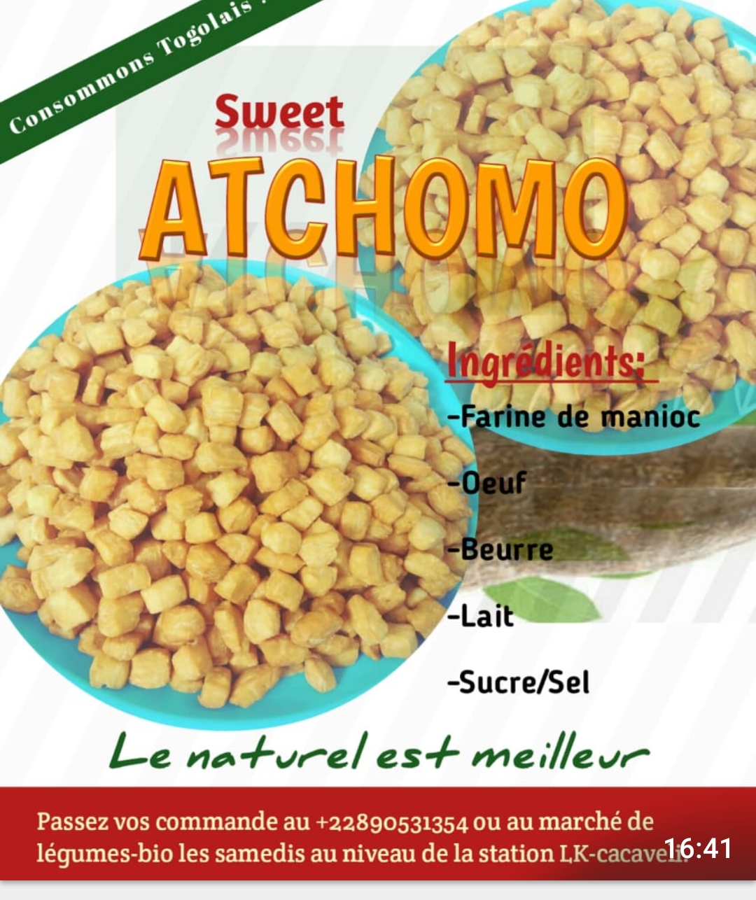 Sweet atchomo est obtenu après passage de la pâte dans de l’huile d’arachide chaude. Tout ceci est fait dans le respect des règles d’hygiènes et d’assainissement.
