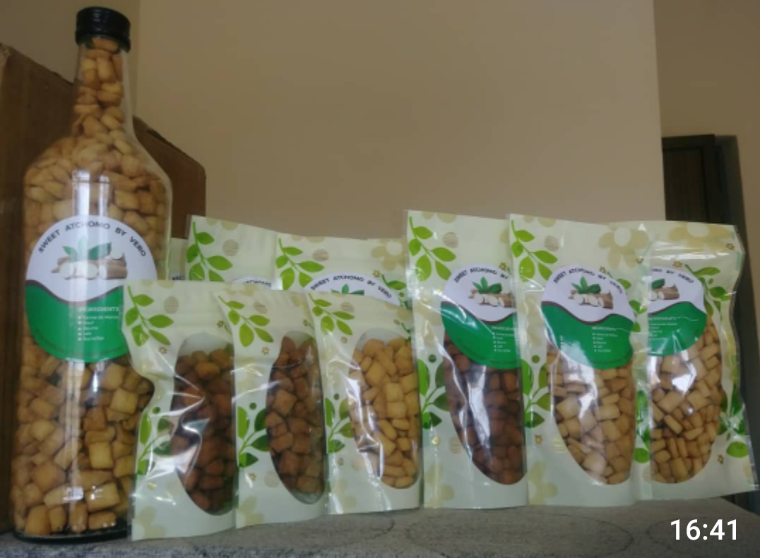 Sweet Atchomo est une croquette faite à base de farine de manioc bio sans gluten, d’œufs de beurre et de lait. Ces ingrédients de base sont alors mélangés avec de l’eau pour obtenir une pâte de farine. Cette pâte est soit préparée en saveur sucrée, salée, coco, miel, cannelle….
